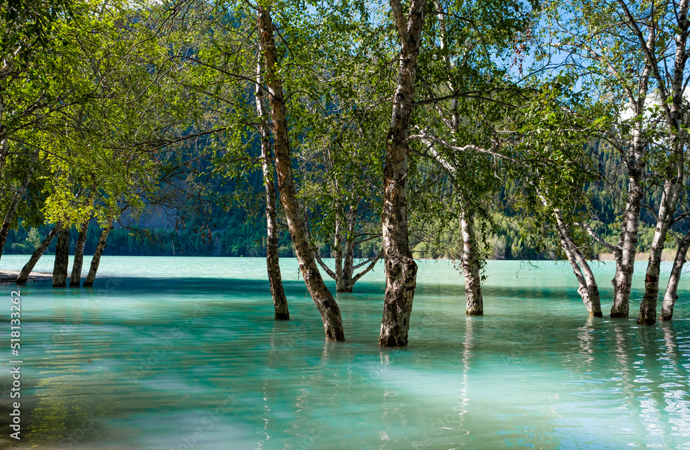 Birch trees stand in the water of a mountain lake. Beautiful mountain landscape near Almaty. A mountain lake with trees in the water.