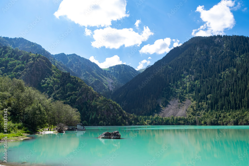 The fantastic beauty of the mountain landscape. A beautiful mountain lake near Almaty. Lake Issyk in Almaty region. Mountain lake.