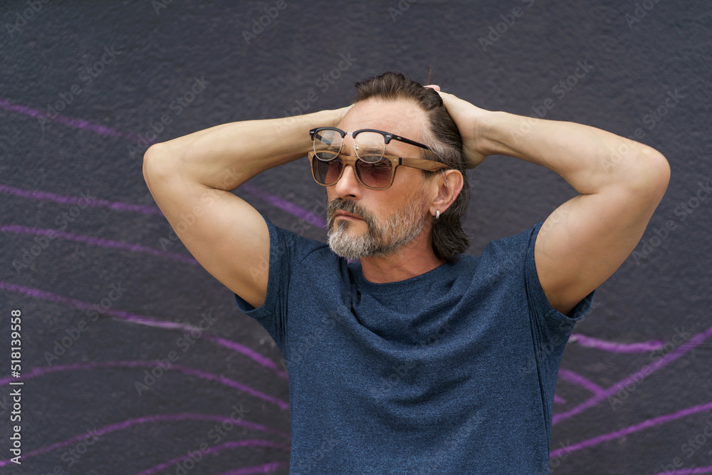 Middle aged man put hands behind head with glasses and sunglasses on his face standing next to dark urban wall wearing dark blue t-shirt. Mature business man or freelancer outdoor