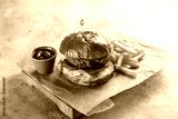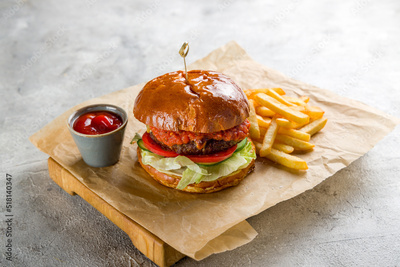 Hamurger with fried vegetables and french fries with ketchup, beef patty