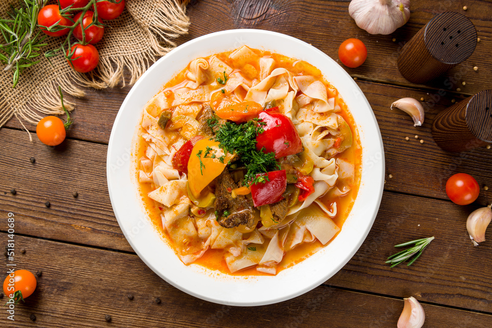 Lagman asian soup with beef and noodles on wooden table