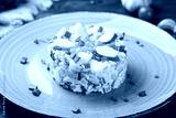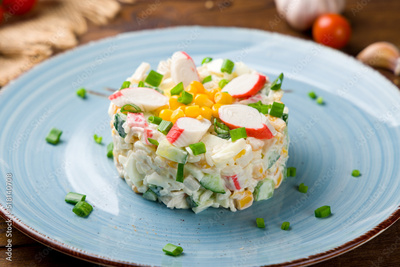 salad with crab meat and tomatoes on old wooden table