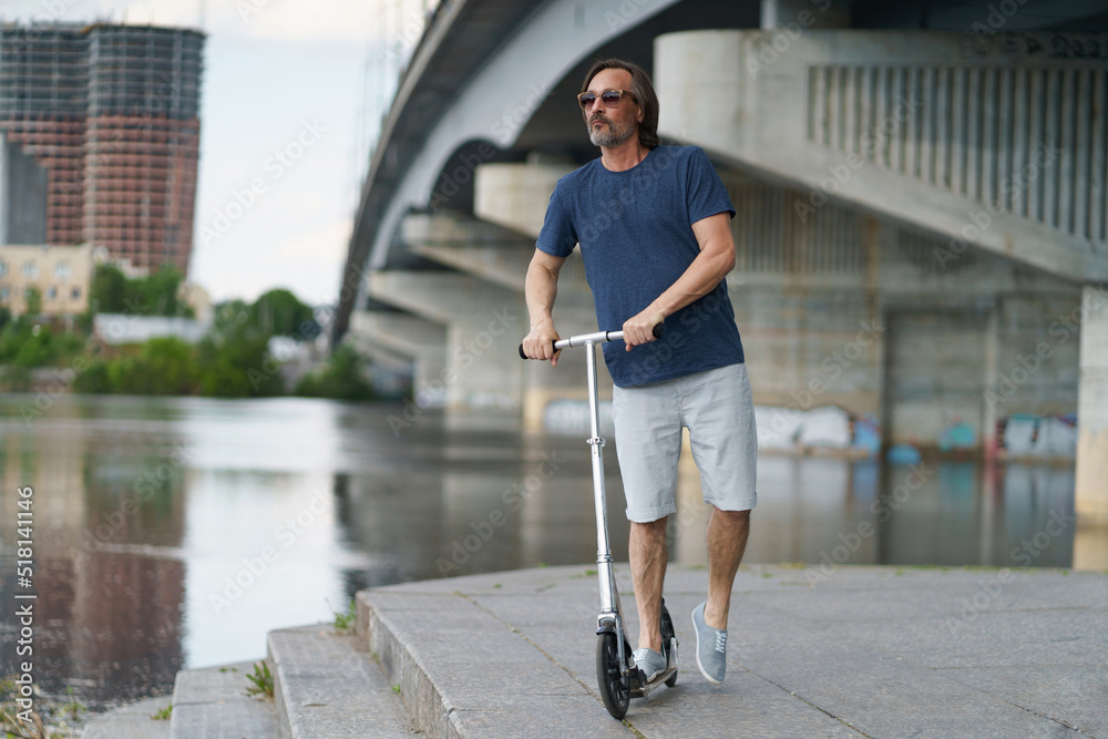Riding scooter handsome stylish middle aged man with grey beard stand under town bridge over river with urban city on background after work outdoors. Travel, lifestyle concept