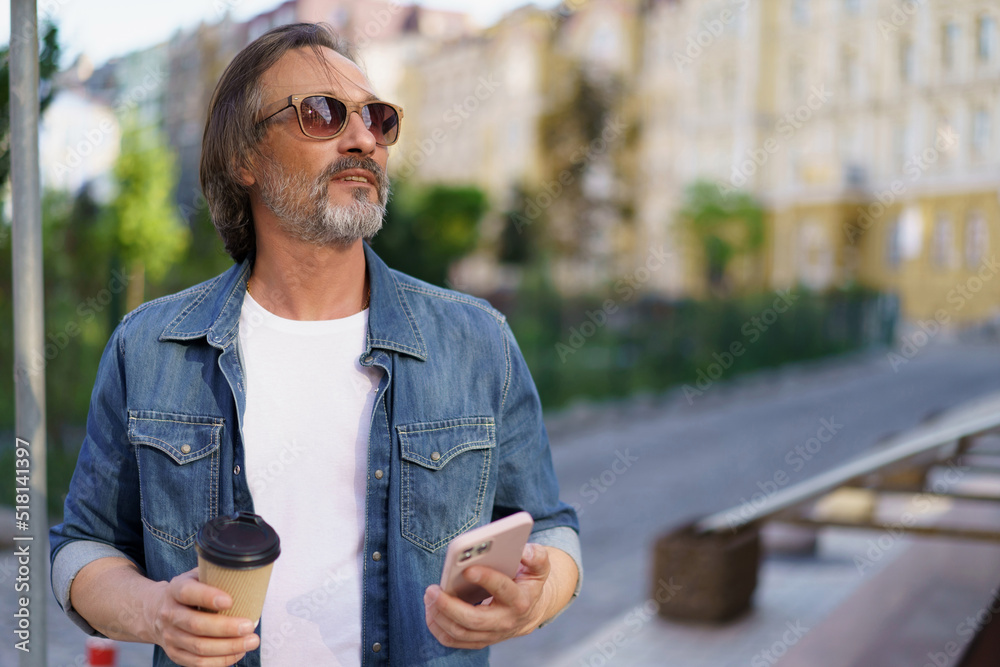 Middle aged man got distracted from mobile phone enjoying coffee outdoors looking at sunset. Middle aged man looking away at street while enjoying free time off work. Business on the go
