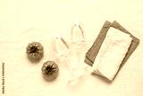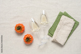 Flat lay two glasses of white wine and decorative pumpkins. Thanksgiving Day. View from above.
