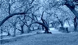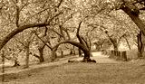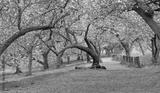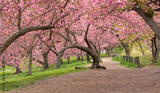 Spring in Central Park New York City. Blooming Kwanzan Cherry trees on Upper West Side of Manhattan. USA