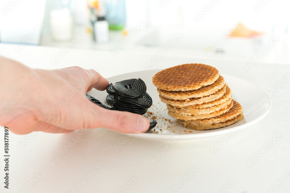 Man's hand holds a plate of stroopwafels or caramel-filled traditional Dutch waffles and a heap of licorice swirls. Waffle. Food. Bakery. Snack. Caramel. Cookie. Dessert. Sweet. Traditional