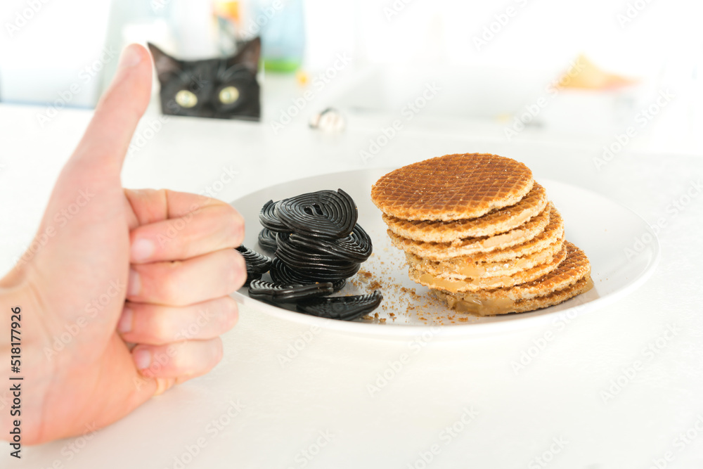 Man's hand shows thumbs up near a plate of stroopwafels or caramel-filled traditional dutch waffles with a cat in the background. Stack. Background. Wafer. Pastry. Treat. Spiral. Thumb. Positive. Like