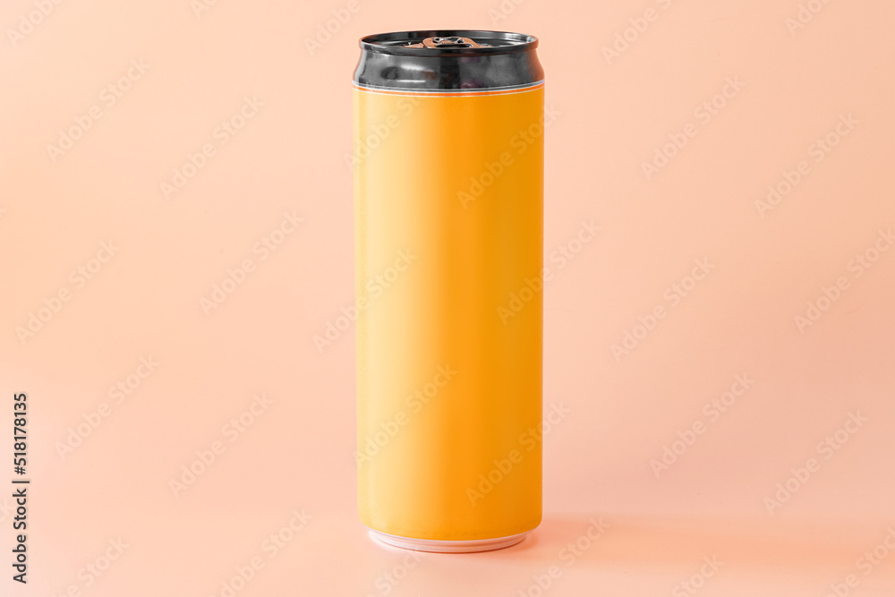 A yellow and black blank aluminum can of beer or energy drink stands on an orange background. Mark. Advertising. Advertise. Drinking. Dairy. Distillery. Factory. Drinker. Production