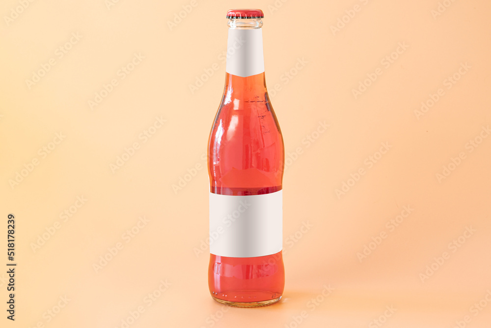 A red glass bottle of cider with white blank labels on a yellow background. Fresh. Traditional. Light. Refreshment. Studio. Label. Trade. Front. Brand Label. Transparent
