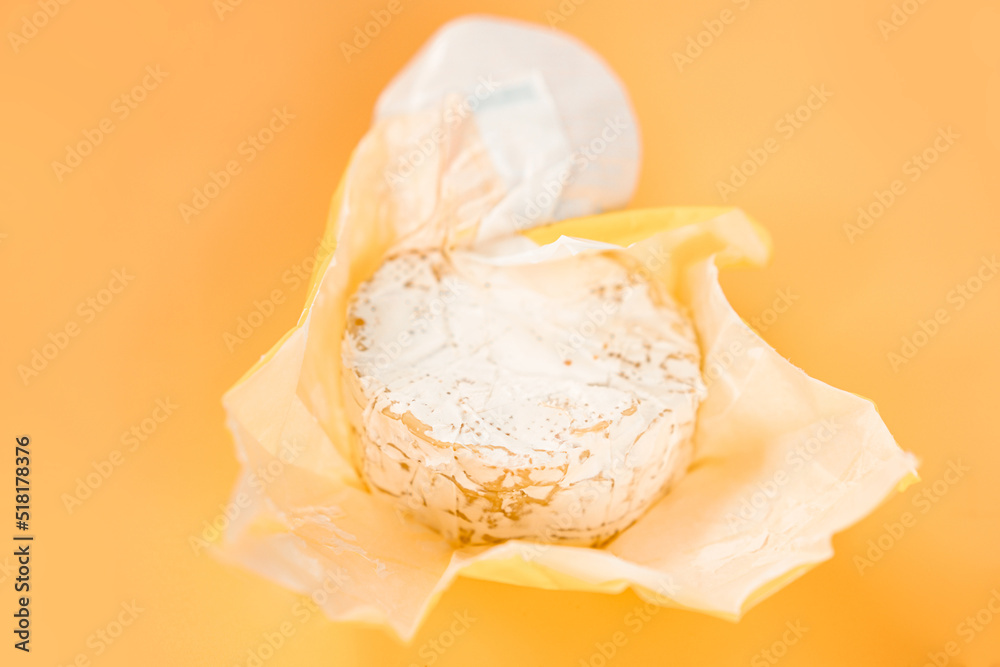 Open paper package of a whole head of camembert on an orange background. Soft cheese covered with edible white mold. Cream. Culinary. Meal. Object. Calories. Fat. Portion. Brie. Delicatessen