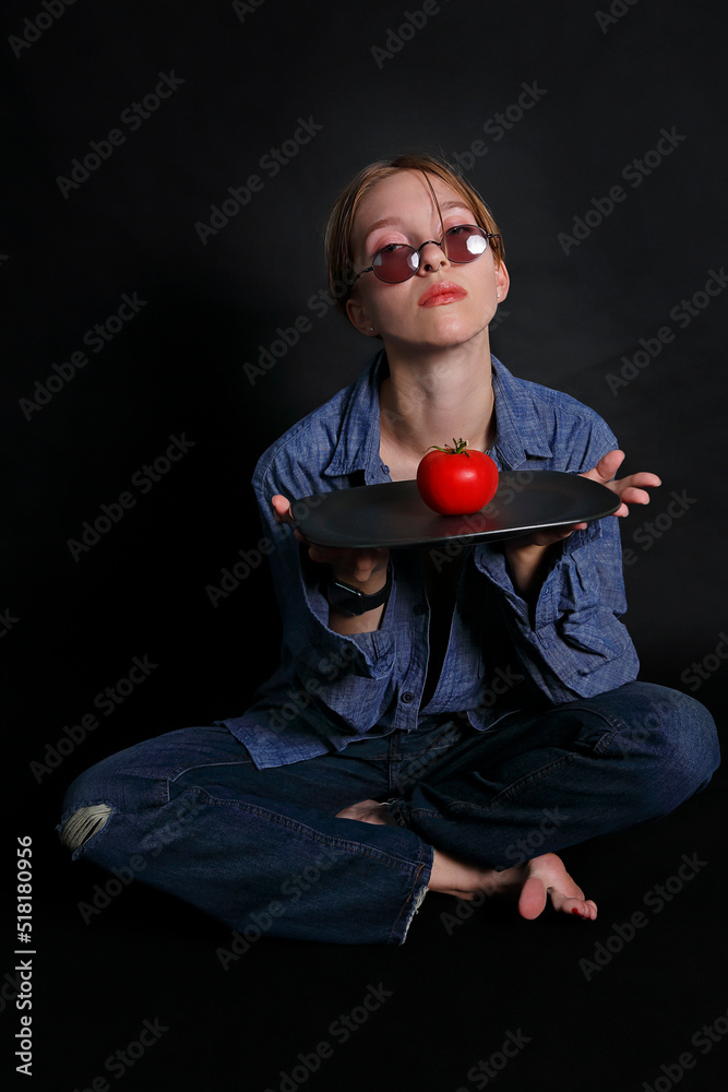 Model squats with a tomato on a plate on a black background. Portrait of a girl in black glasses. Beautiful young sexy woman in jeans and barefoot. Fashion and art. Studio photography.