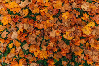 beautiful yellow maple leaves fallen from trees lie on the grass