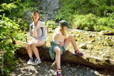 Two young girls hiking in Strazyska Valley in Tatra Mountain range, Podhale, Poland.