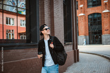 Portrait of a stylish hipster guy in sunglasses with a backpack in the city against the background of a modern city building.