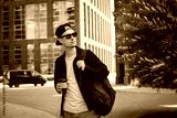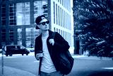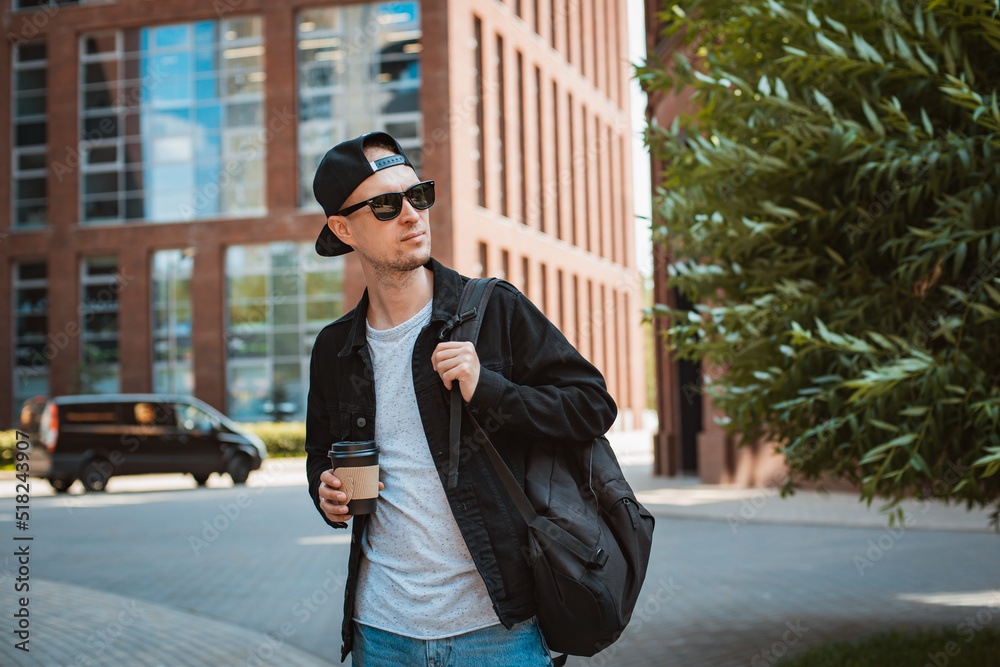 Portrait of a stylish hipster guy in sunglasses with a backpack in the city against the background of a modern city building.