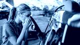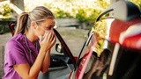 A young nurse prepares for her shift at work. A nurse dressed in her uniform standing outdoors in front of her car with a mask on her face during the day.
