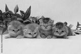 British longhair kittens on white background with green leaves. Golden chinchilla highlander. Cute fluffy kitten . Pets at cozy home. Top view web banner. Funny adorable pets cats. Postcard concept.