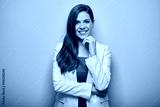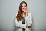 Happy thinking business woman in white suit isolated portrait.