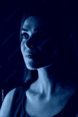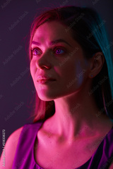 Futuristic look woman with red light, looking away, female face beauty portrait with colored light. natural skin.