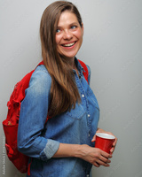 Smiling female student looking back over shoulder isolated portrait with coffee glass.