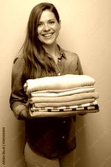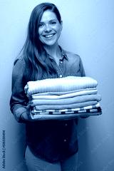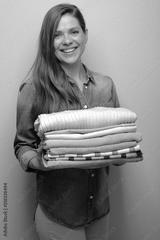 isolated portrait laundry hotel service concept. Smiling maid woman with clothes stack or bed sheets, towels.