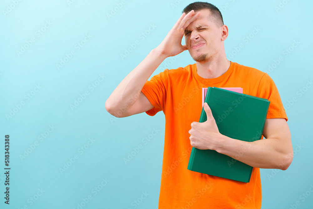 An sad man in an orange t-shirt holding his head and making grimace on a blue background, while he is holding files. Youth. Stand. Teenage. Teenager. Boy. Work. Employee