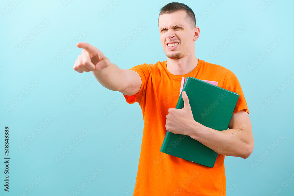 An angry sad man in an orange t-shirt points at someone straight on a blue background, while he is holding files. Youth. Stand. Teenage. Teenager. Boy. Work. Employee