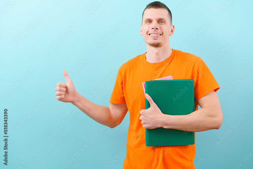 A student in an orange t-shirt holding folder and showing his thumb up on a blue background. Person. Education. Folder. Student. Study. Man. Background. School. Success. University. Positive. Good