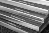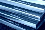 Toughened glass, protection of glass panes in a special furnace, Burnt inscription denoting ready and protected material against easy breakage. Glass industry