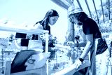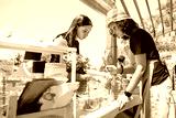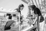 Young brunette girl buyer with long hair and woman seller in apron and hat on either side of the counter with goods at the street fair in summer