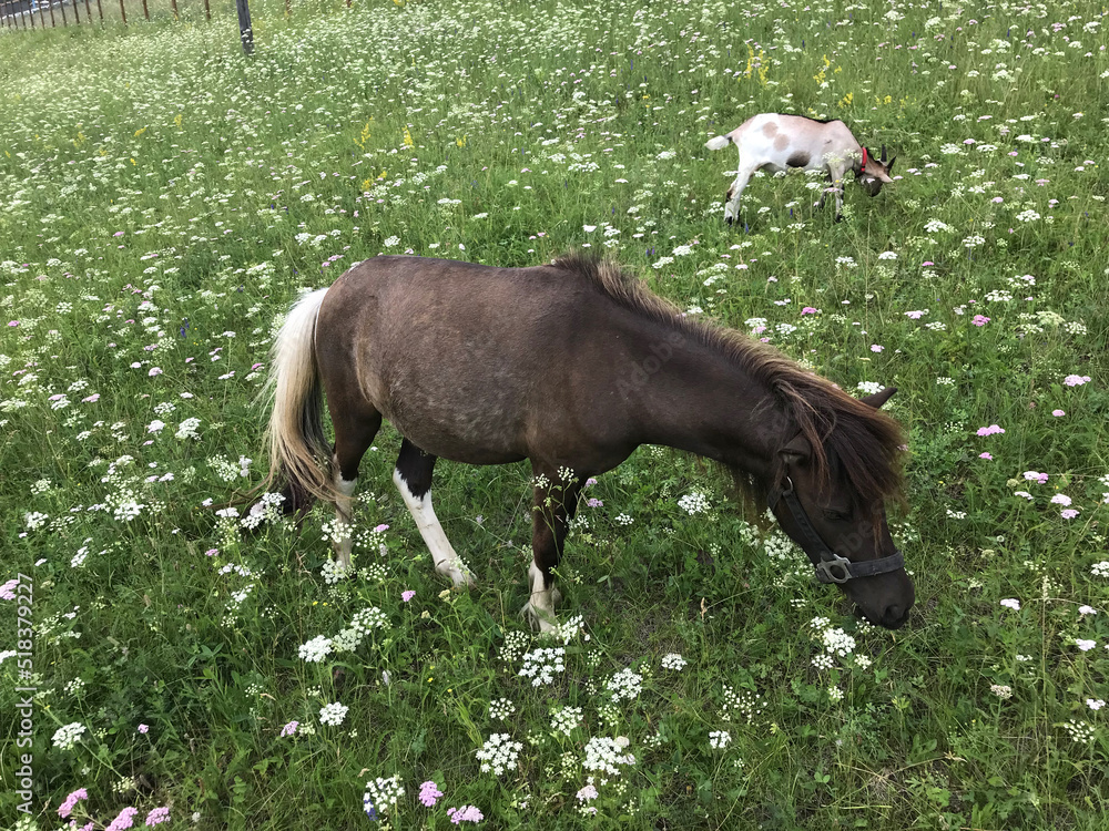 little pony horse walking on a green summer field
