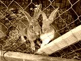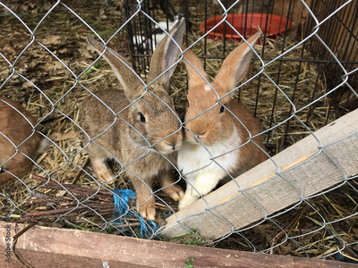 many fluffy beautiful rabbits in the nursery behind the cage