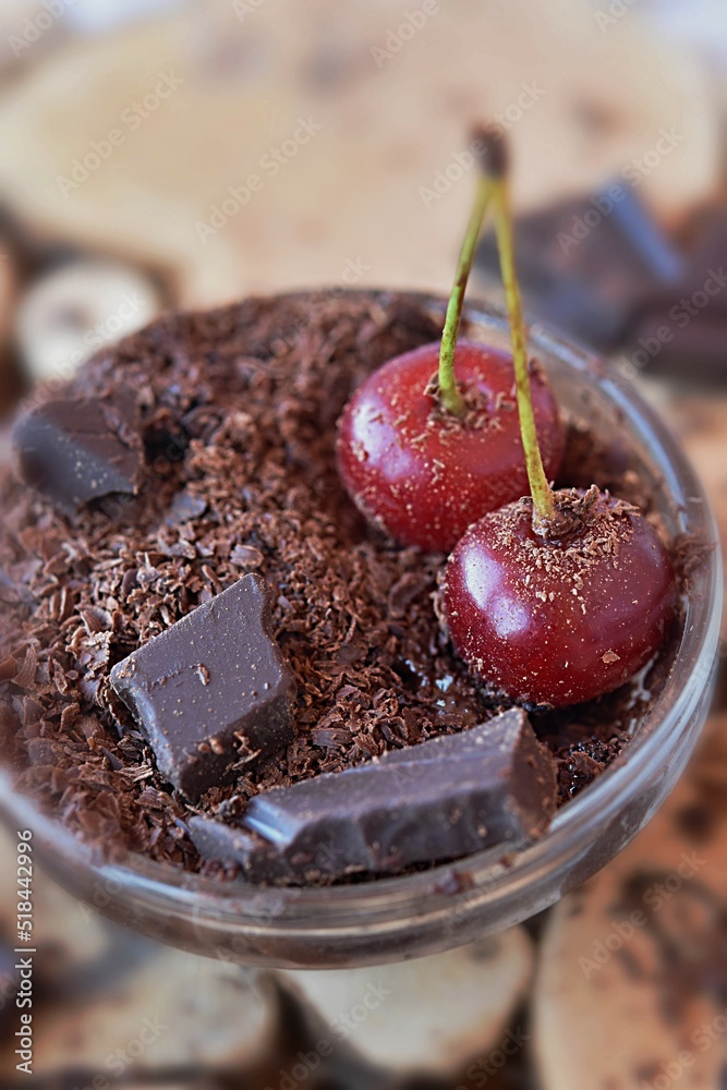 red cherry in chocolate chips and dark chocolate pieces. dessert