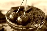 red cherry in chocolate chips and dark chocolate pieces. dessert