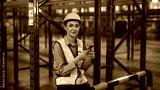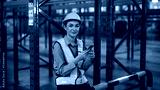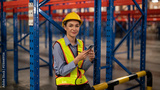 female warehouse worker Work at a distribution center looking at camera Standing at a large warehouse, the new arrival of additional items in the warehouse department. Employees , organize