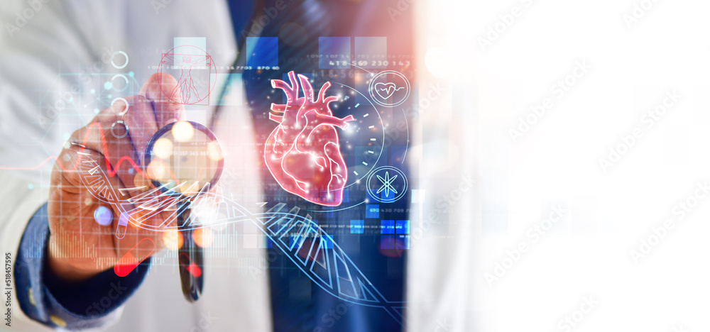 doctor's hand touches virtual screen interface with stethoscope. Medical icon network connection on modern virtual screen networking interface on hospital background, modern medical technologies
