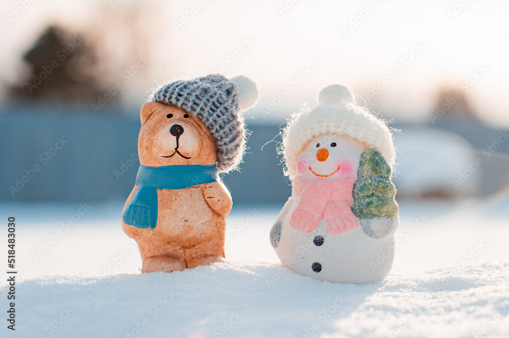Christmas fun decorative figurines on a snowy background. Christmas card.