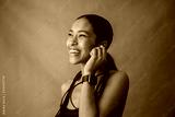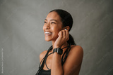 Close up Young Multiethnic female smiling and listening to her ear pods