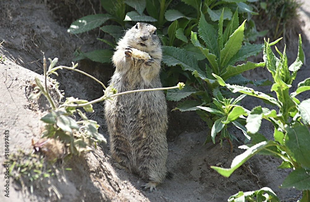 ground squirrel stands near a hole in the tract Dzhily-su Kabardino-Balkaria Russia. copy space