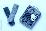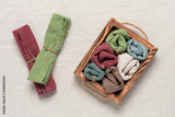 Colored linen napkins stacked on a roll in a wooden tray, beige linen background. Top view, flat lay. Selective focus.