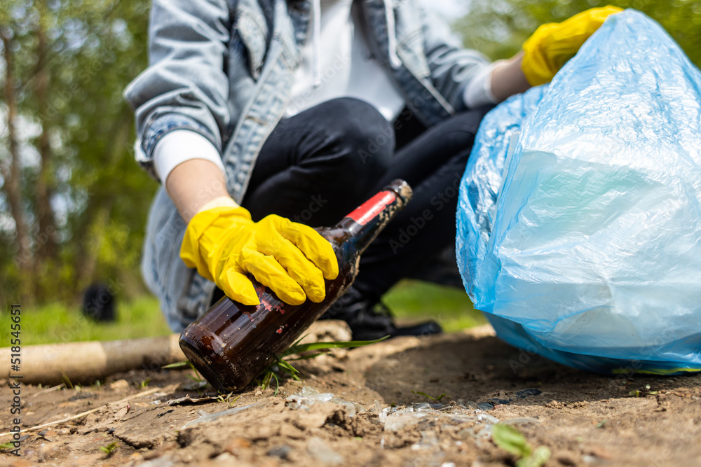 A woman picks up an abandoned glass bottle in the forest. Environmental garbage pollution