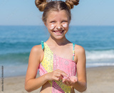 A young girl applies sunscreen to her body on the beach.