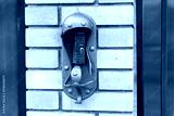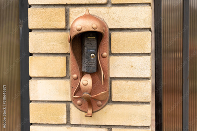 intercom panel with a video camera on the brick fence of private house