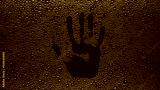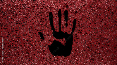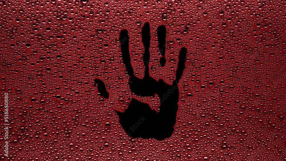 Handprint printed on the wet glass with red drops on black background | shower concept