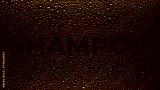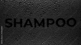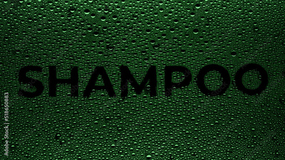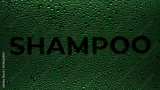 Text shampoo printed on the wet glass with green drops on black background | shampoo commercial