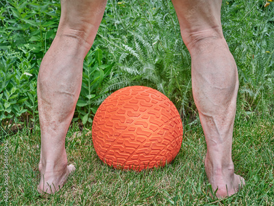 senior man legs and heavy rubber slam ball filled with sand in a backyard, exercise and functional fitness concept