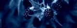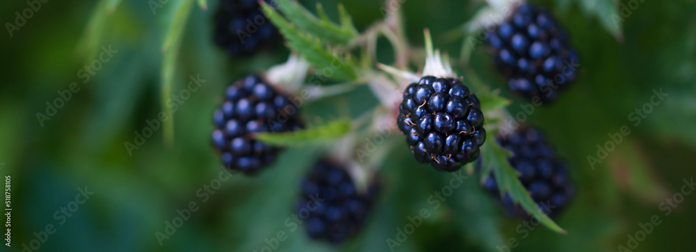 Blackberries fruit close up, large berries, ripe and juicy growing in the summer garden, green blurred background, self sufficiency and healthy food concept