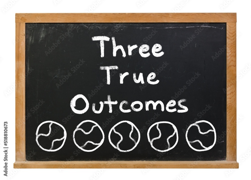 Three true outcomes written in white chalk on a black chalkboard isolated on white