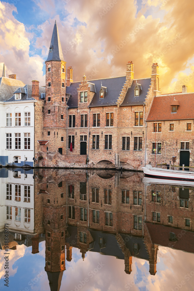 Rozenhoedkaai canal (Quai of the Rosary), and Belfort van Brugge’s Belfry Tower. Typical view of Bruges (Brugge), Belgium.